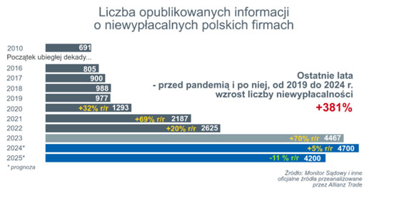 W najnowszym globalnym raporcie Allianz Trade analitycy ubezpieczyciela przewidują, że 2024 będzie piątym rokiem wzrostu niewypłacalności w Polsce. Ich tegoroczna liczba ma być blisko czterokrotnie wyższa niż w 2019 r.