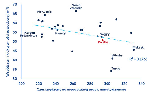 Jednak wyniki w zakresie równouprawnienia pod względem pracy i finansów pozostają w tyle, ponieważ kobiety spędzają więcej czasu na nieodpłatnej pracy. Współczynnik aktywności zawodowej kobiet nie podąża za szybką trajektorią dynamiki edukacji, wzrastając o około 5 punktów procentowych, ze średnio 48% w 1993 r. do 53% w 2023 r. (w Polsce 51%). Niezwykle istotnym (a niedocenianym) elementem negatywnie wpływającym na udział kobiet w rynku pracy jest praca nieodpłatna, ponieważ kobiety nadal w przeważającej mierze przejmują obowiązki związane z prowadzeniem gospodarstwa domowego. W krajach OECD kobiety poświęcają średnio 127 minut więcej na pracę nieodpłatną niż mężczyźni i około pół godziny więcej niż mężczyźni na pracę ogółem – płatną i nieodpłatną. W Chinach, jedynym innym kraju spoza OECD, który został wzięty pod lupę, kobiety spędzają 143 minuty dziennie więcej na pracy nieodpłatnej niż mężczyźni i 94 minuty więcej na pracy ogółem w porównaniu do swoich rówieśników płci męskiej.