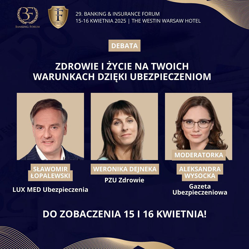 16 kwietnia w ramach ubezpieczeniowej części 29. edycji Banking & Insurance Forum odbędzie się debata zatytułowana „Zdrowie i życie na Twoich warunkach dzięki ubezpieczeniom”. Patronem medialnym Insurance Forum jest „Gazeta Ubezpieczeniowa”.
