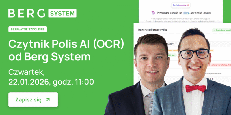Tematem webinaru będzie czytnik polis AI – nowe narzędzie, które pozwala na zmianę modelu pracy. Dzięki narzędziu wszystkie zgromadzone polisy można przesłać do CRM zbiorczo na koniec dnia, zamiast uzupełniać dane w systemie po każdym spotkaniu. Berg System samodzielnie „odczyta” dokumenty i przypisze dane do odpowiednich kartotek.