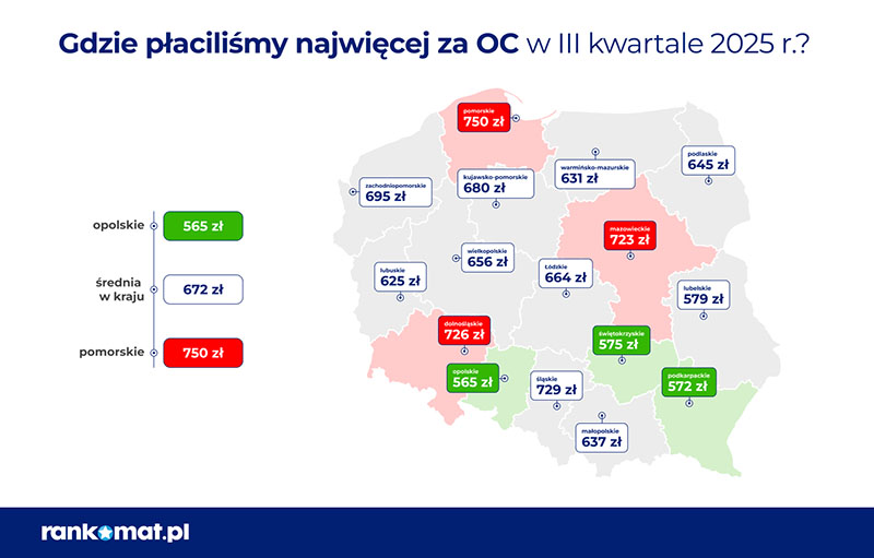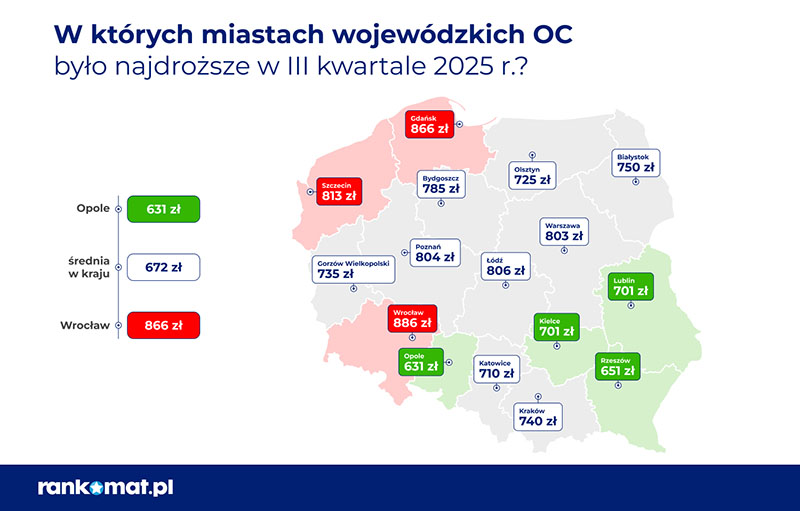 Z analizy cen OC porównywarki Rankomat.pl wynika, że w III kwartale 2025 r. najwięcej za obowiązkowe ubezpieczenie płacili kierowcy z Wrocławia (886 zł), Gdańska (866 zł) i Szczecina (813 zł). Towarzystwa ubezpieczeniowe proponowały najtańsze polisy OC mieszkańcom Opola (631 zł), Rzeszowa (651 zł) i Lublina oraz Kielc (po 701 zł). Różnica średnich cen OC między najdroższym miastem wojewódzkim a najtańszym wyniosła ponad 40%.