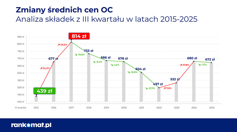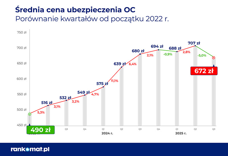 Od II kwartału 2023 roku średnia cena OC regularnie rosła. W II kwartale 2025 roku odnotowała najwyższy poziom od 2018 roku i przekroczyła 700 zł. Jednak kolejne 3 miesiące przyniosły obniżkę na poziomie 5%. Analizy rynkowe mówią o stabilnej sytuacji ubezpieczycieli, dlatego wracają do walki o klienta najskuteczniejszą metodą – ceną. Nie spodziewałbym się jednak spektakularnych obniżek w krótkim czasie. Koszty obsługi ubezpieczeń i likwidacji szkód wciąż rosną, dlatego towarzystwa ostrożnie podchodzą do konkurencji. Będą kusić swoich klientów dodatkowymi rozszerzeniami, warto więc porównać wszystkie oferty, aby wybrać najkorzystniejszą z nich – komentuje Bartosz Niewiadomski, prezes zarządu Rankomat.pl.