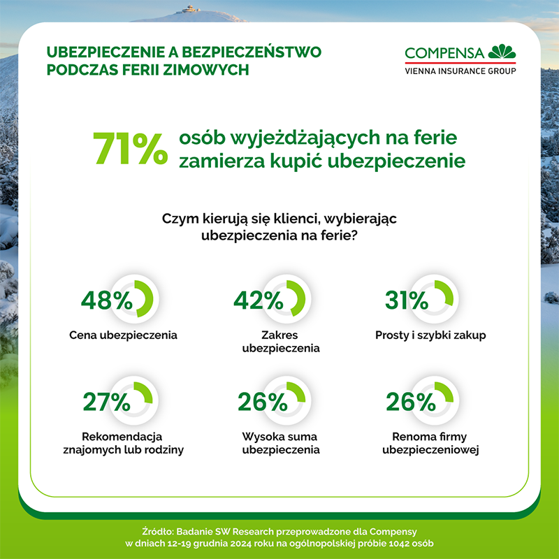Choć ponad połowa uczestników badania „Wyjazdy Polaków na ferie” przeprowadzonego na zlecenie Compensy planuje wyjazd, większość szuka oszczędności – wybiera tańsze hotele lub mniej popularne kierunki. 71% nie wyobraża sobie zimowego wyjazdu bez odpowiedniej polisy.