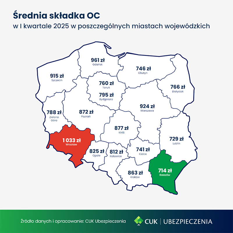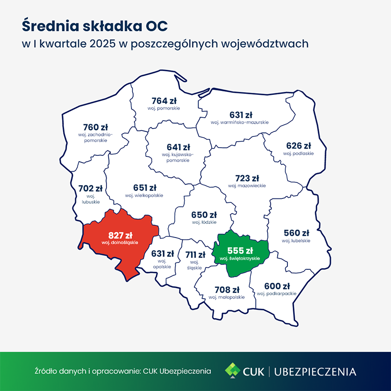 Analiza CUK Ubezpieczenia ujawniła istotne różnice w cenach OC ppm. pomiędzy poszczególnymi województwami w Polsce. Najwyższą średnią składkę (827 zł) odnotowano w dolnośląskim. Na przeciwległym biegunie znalazło się świętokrzyskie ze średnią na poziomie 555 zł. Największy procentowy wzrost w skali roku zanotowano w podkarpackim (25%), a najmniejszy w lubelskim (13%).