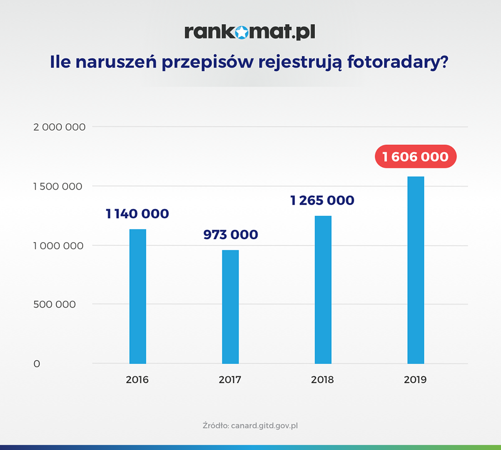 Z danych Centrum Automatycznego Nadzoru nad Ruchem Drogowym wynika, że w 2019 r. wystawiono ponad 700 tys. mandatów w efekcie zarejestrowania przez fotoradary naruszeń przepisów ruchu drogowego – o 285 tys. więcej niż w roku poprzednim. W 2019 r. rekordzista przekroczył dopuszczalną prędkość o 149 km/h – wskazuje Rankomat.