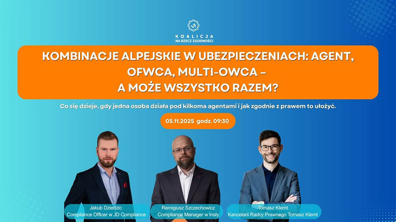 5 listopada 2025 roku odbędzie się kolejny webinar z cyklu „Compliance w ubezpieczeniach” zatytułowany „Kombinacje alpejskie w ubezpieczeniach: agent, OFWCA, Multi-OFWCA – a może wszystko razem? Jak zachować zgodność z przepisami i nie pogubić się w gąszczu obowiązków”. Patronem medialnym wydarzenia odbywającego się w ramach powołanej przez Insly Koalicji na rzecz zgodności jest „Gazeta Ubezpieczeniowa”.
