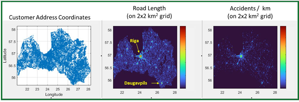Nasze badanie łotewskiego systemu Bonus-Malus jest przykładem efektywnego wykorzystania alternatywnych danych w celu usprawnienia modeli analitycznych. Projekt objął dane dotyczące całego łotewskiego rynku motoryzacyjnego. Analizowaliśmy m.in. współrzędne adresów klientów, lokalizacje dróg oraz miejsca występowania wypadków drogowych. Kluczowym etapem procesu było przedstawienie danych w formie siatki 2×2 km², w której analizowano długość dróg oraz liczbę wypadków przypadającą na jednostkę długości.