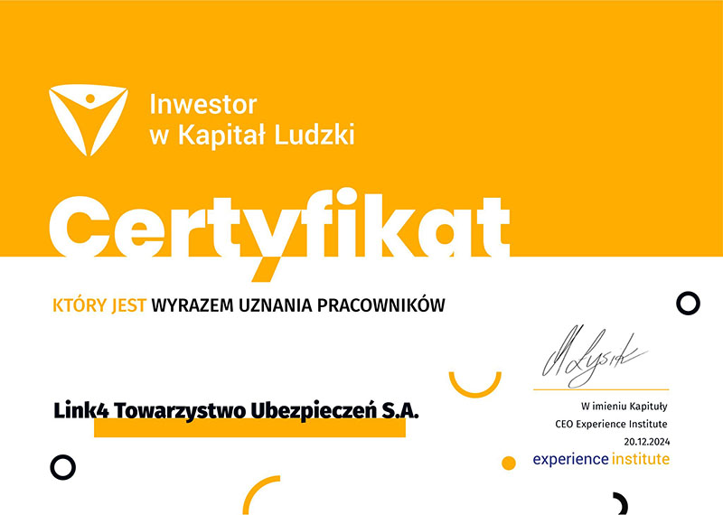 LINK4 otrzymał certyfikat Inwestor w Kapitał Ludzki 2024. To kolejny taki tytuł przyznany ubezpieczycielowi na podstawie wewnętrznego badania ankietowego „Mów, co myślisz”.