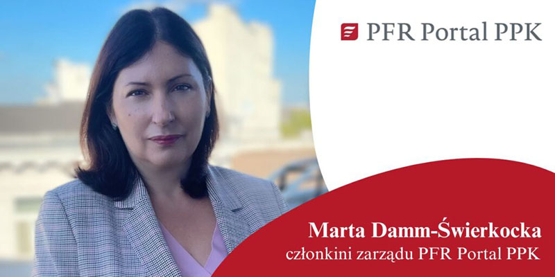 Marta Damm-Świerkocka to menedżerka z wieloletnim doświadczeniem w zarządzaniu spółkami kapitałowymi, ekspertka programów emerytalnych. Od 2020 roku związana z PFR Portal PPK sp. z o.o. jako ekspertka komunikacji wewnętrznej i zewnętrznej oraz PR. Autorka licznych publikacji na temat systemów zabezpieczenia emerytalnego, organizatorka konferencji i wydarzeń promujących długoterminowe oszczędzanie.
