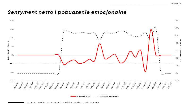 Przeanalizowaliśmy nastawienie internautów do badanego tematu, z wykorzystaniem wskaźnika sentymentu netto, obrazującego różnicę między natężeniem nastrojów pozytywnych oraz negatywnych – oddziela je linia 0%. Wynik obrazuje umiarkowanie krytyczne podejście komentujących do prezentowanych wydarzeń.