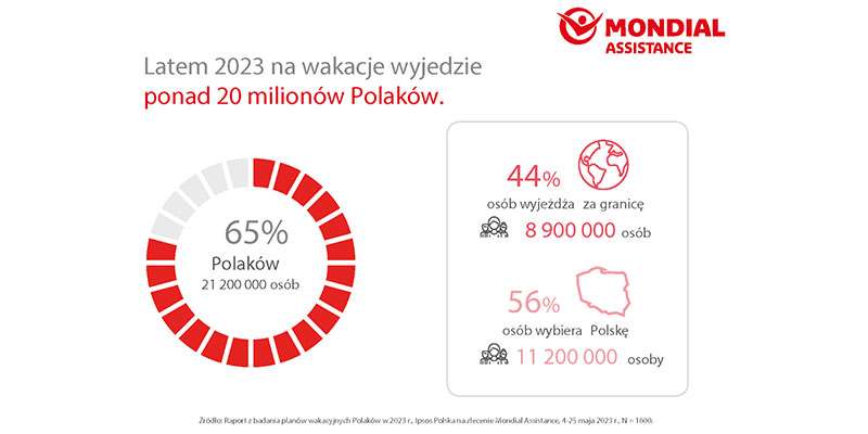 Z odpowiedzi uczestników pierwszej postpandemicznej edycji badania Mondial Assistance „Plany Wakacyjne Polaków” wynika, że 65% ankietowanych planuje wyjazd wakacyjny. Oznacza to, że w tym sezonie planuje odpocząć ponad 20,1 mln osób. Z tej liczby 8,9 mln wyjedzie za granicę, a do najpopularniejszych destynacji od lat należą Chorwacja, Grecja i Hiszpania.