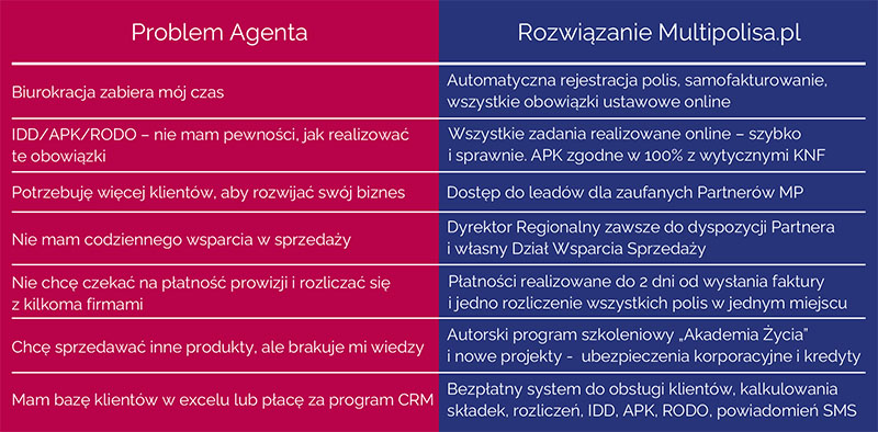 T.C.: – Nasza propozycja dla agentów to efekt rozmów z partnerami, pomysłów kadry dyrektorów regionu i wielu lat doświadczenia na rynku ubezpieczeń i finansów. Rozwiązania problemów agentów demonstruje tabela.