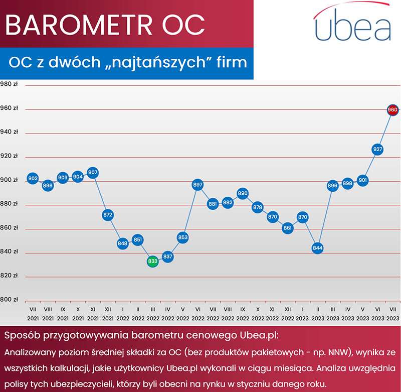 Eksperci porównywarki wskazują, że wzrost średniej składki OC ppm. w dwóch najtańszych towarzystwach trwa już od pięciu miesięcy (marzec–lipiec 2023 r.). Szczególnie widoczny był w czerwcu i lipcu, kiedy to średnia stawka skoczyła z 901 zł do 960 zł. W tym samym okresie wzrost odnotowano we wszystkich zakładach, których polisy dostępne są za pośrednictwem Ubea. – Wciąż czekamy na dane KNF pokazujące, jak analogiczny wynik finansowy na sprzedaży OC wyglądał w pierwszej połowie bieżącego roku – mówi Paweł Kuczyński, prezes Ubea.