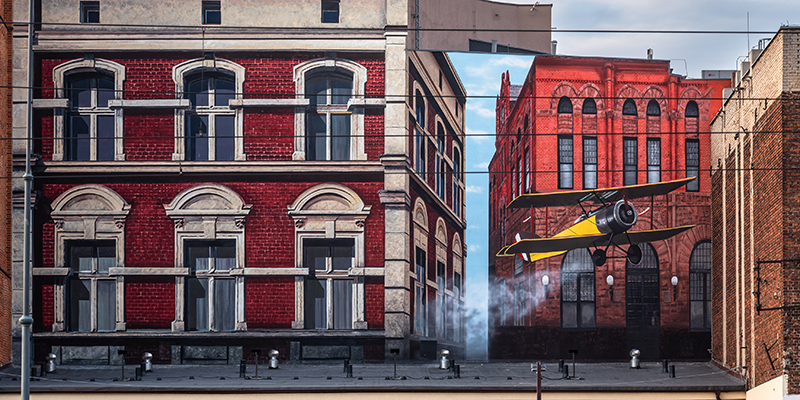 W swojej treści mural nawiązuje do pofabrycznego ducha Łodzi, a także do podniebnej karty historii miasta. Spomiędzy fabrycznych zabudowań wyłania się kontrastujący z czerwoną cegłą żółty samolot. Łódź odegrała bowiem istotną rolę w rozwoju polskiej myśli lotniczej.