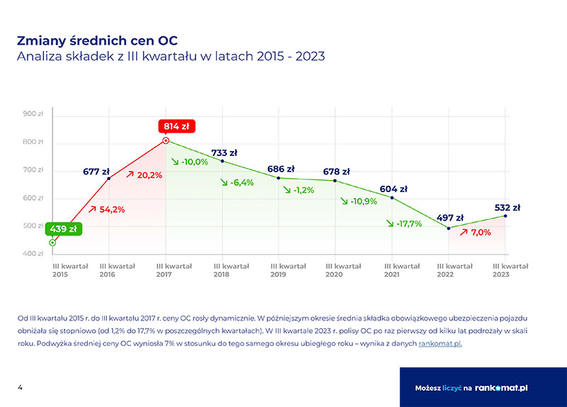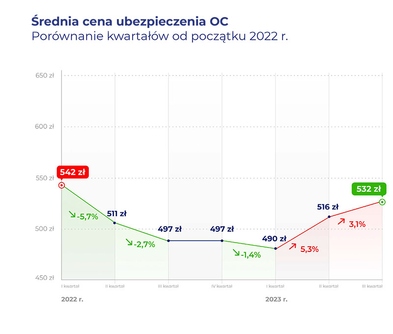 Średnia cena OC w III kwartale 2023 roku wyniosła 532 zł, czyli była o 7% wyższa niż w analogicznym okresie ubiegłego roku. W ostatnim kwartale odnotowano podwyżkę również w stosunku do II kwartału 2023 roku. Wyniosła ona 16 zł, co można traktować jako zapowiedź dynamicznego wzrostu cen w kolejnych kwartałach. Wrzesień 2023 roku jest trzecim miesiącem z rzędu z podwyżkami cen OC.