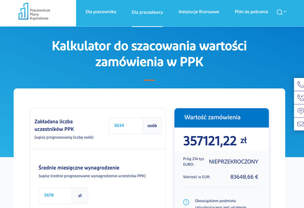 Na portalu MojePPK opublikowane zostały nowy kalkulator do szacowania wartości zamówienia oraz strona internetowa „PPK w sektorze publicznym” poświęcona Pracowniczym Planom Kapitałowym. Materiały te zostały specjalnie przygotowane przed planowanym na 1 stycznia czwartym etapem wdrażania PPK, w ramach którego do programu przystąpią jednostki sektora finansów publicznych (JSFP).