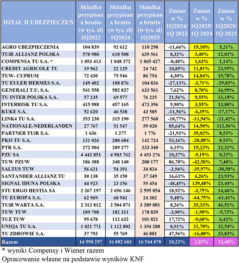 Kolejną dużą firmą, która zanotowała spadek sprzedaży w porównaniu z I kw. 2024 r., była ERGO Hestia. Miała już spadek sprzedaży w I kw. 2025 r., ale osiągnęła wzrost ponad 14% w porównaniu z I kw. 2023 r. Trudno to jednoznacznie ocenić. I miejmy taką nadzieję, że kolejne kwartały będą dla niej lepsze.