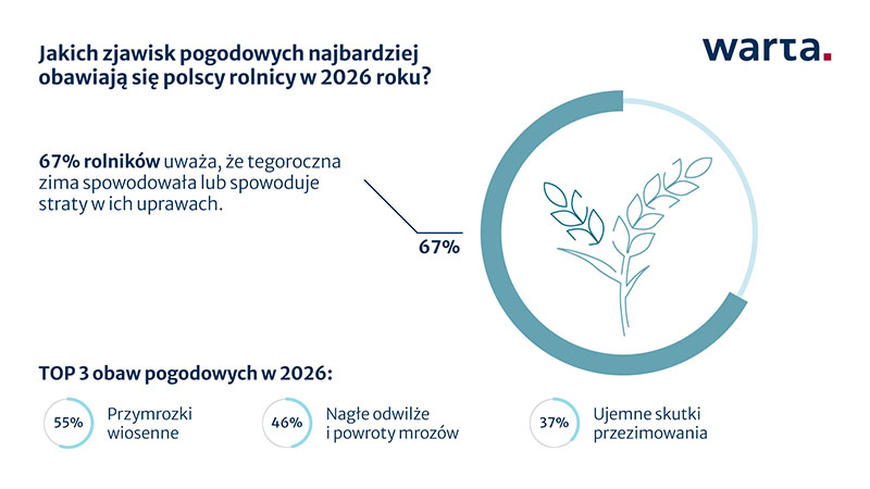 Według badań 67% rolników uważa, że zima 2025/2026 spowodowała lub spowoduje realne straty w ich uprawach. Skala problemu jest uderzająca, gdy zestawimy ją z danymi z ostatnich dwóch lat, kiedy to straty pogodowe deklarowało jedynie 21% badanych.