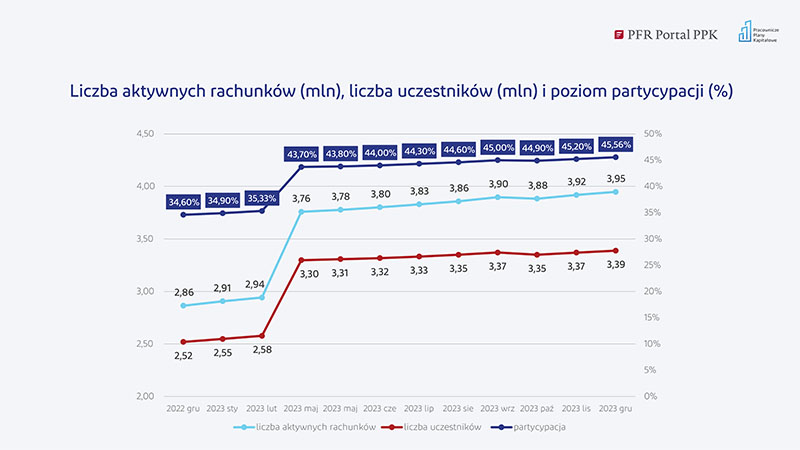 Poprzedni rok PPK zaczęły z liczbą nieco ponad 2,5 mln uczestników, 2,86 mln aktywnych rachunków oraz partycypacją na poziomie 34,6%. Wraz z jego końcem widoczny jest wzrost wszystkich tych parametrów. Liczba uczestników wzrosła do niemal 3,39 mln, tj. o prawie 870 tys. (+34,50% r/r), liczba aktywnych rachunków wzrosła do niemal 3,95 mln, tj. o ponad 1,08 mln (+37,85% r/r). Partycypacja w programie zwiększyła się do 45,6%, tj. o 10,96 pkt. proc. (+31,68% r/r).