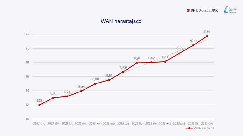 Dobre wyniki funduszy zdefiniowanej daty oraz zwiększona wartość wpłat w wyniku przystąpienia dużej liczby nowych członków do programu przełożyła się na szybki wzrost WAN. Na koniec 2023 r. wyniósł on niemal 22 mld zł, co oznacza wzrost o 9,76 mld (+81,48% r/r).