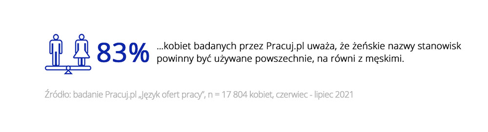 Ponad 8 na 10 kobiet badanych przez Pracuj.pl uważa, że żeńskie nazwy stanowisk powinny być używane powszechnie na równi z męskimi. Ponadto 3/4 z nich oczekuje feminatywów w ogłoszeniach o pracę, a także chciałoby mieć wpływ na nazwę swojego stanowiska – wynika z badania „Język ofert pracy”.