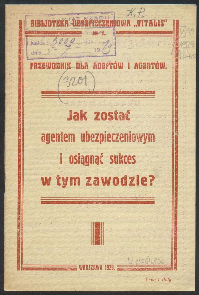 Przewodnik z 1929 r. dla adeptów i agentów Jak zostać agentem ubezpieczeniowym i osiągnąć sukces w tym zawodzie? to kompendium wiedzy adeptów ubezpieczeniowych z zakresu merytoryki produktowej, sprzedażowej oraz, co bardzo ważne, zawiera także rady starszych doświadczonych kolegów po fachu.