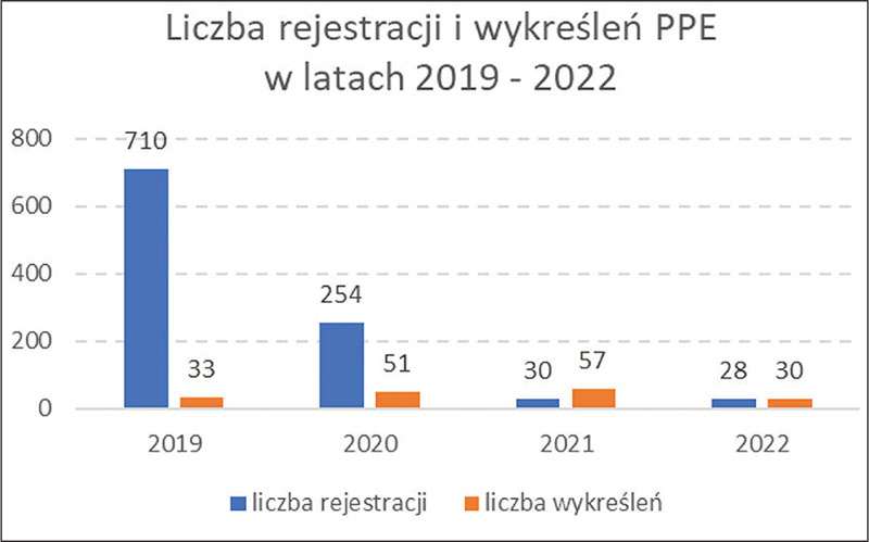 Spadek liczby funkcjonujących PPE w latach 2021 i 2022 wynika z niewielkiej przewagi wykreśleń PPE (z rejestru pracowniczych programów emerytalnych) nad nowymi rejestracjami programów, co obrazuje wykres.