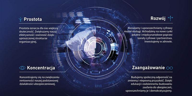 Nowa strategia jest osadzona na 4 filarach biznesowych. Zakładają one uproszczenie struktury, w tym konsolidację aktywów bankowych, koncentrację na rozwoju podstawowej działalności ubezpieczeniowej, rozwój poprzez inwestycje w obszarze cyfrowym i w sektor zdrowotny. A także zaangażowanie w budowę odporności społecznej dzięki działaniom prewencyjnym i edukacyjnym.