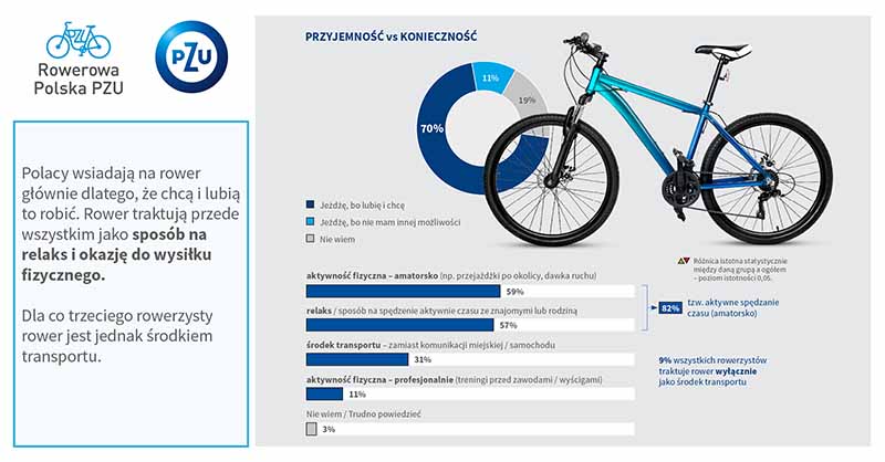Z badania będącego podstawą raportu wynika, że 80% ankietowanych w wieku 18–65 lat to aktywni rowerzyści, a tylko 1% deklaruje, że nigdy nie jeździło na rowerze. 82% rowerzystów traktuje jazdę jako sposób na aktywny relaks, 77% – jako sposób dbania o zdrowie, a niemal 60% wykorzystuje rower także do codziennego przemieszczania się, m.in. do pracy czy szkoły.