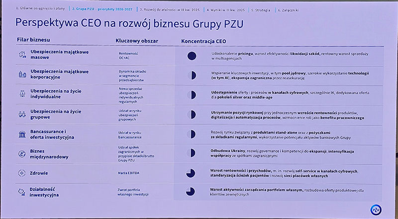 Mimo tego obraz nie jest jednoznaczny. W części komunikacyjnej dynamika sprzedaży okazała się niższa od oczekiwań, czego powodem była m.in. agresywna polityka cenowa konkurencji. PZU planuje udoskonalić narzędzia pricingowe, zwiększyć efektywność likwidacji szkód przez wprowadzić nowy system oraz poprawić rentowność w kanale multiagencyjnym.