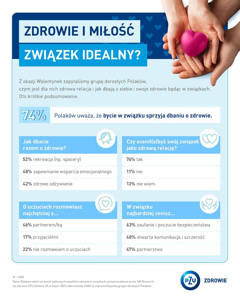 Z ogólnopolskiego badania opinii przeprowadzonego z okazji Walentynek przez PZU Zdrowie wynika, że jego uczestnicy chętnie podejmują w parach działania prozdrowotne, takie jak rekreacja, zapewnianie wsparcia emocjonalnego czy zdrowe odżywianie. Jedna trzecia deklaruje także wspólne motywowanie do wykonywania badań profilaktycznych.
