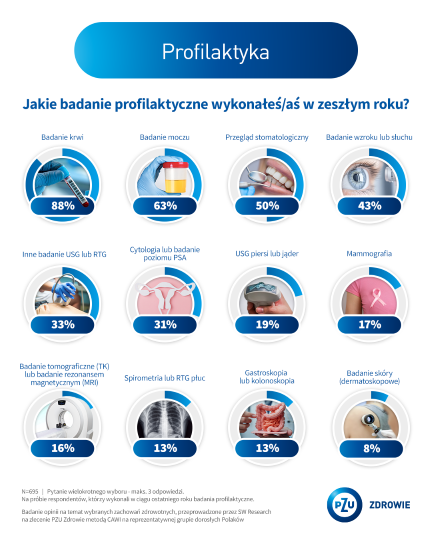 Z odpowiedzi respondentów wynika ponadto, że 69% z nich w ciągu roku wykonało choć jedno badanie profilaktyczne. Najczęstszym rodzajem badań było: