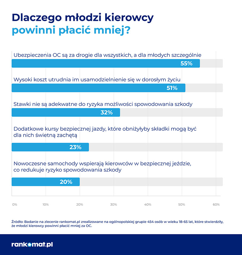 55% respondentów, którzy przyznali, że młodzi kierowcy powinni płacić mniej, argumentuje, że ceny OC ppm. są za wysokie dla wszystkich, a dla najmłodszych szczególnie. Z kolei 51% przyznało, że takie koszty utrudniają im usamodzielnienie się w dorosłym życiu. 32% uważa, że obecne stawki nie odzwierciedlają ryzyka wystąpienia szkody. Najrzadziej wskazywano, że nowoczesne samochody wspierają kierowców w bezpiecznej jeździe, co redukuje ryzyko spowodowania szkody.