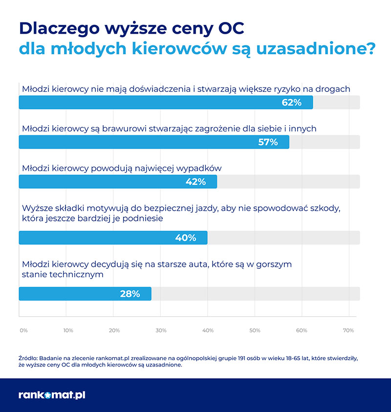 Z kolei wśród ankietowanych, którzy uważają, że młodzi płacą adekwatne składki, dominuje przekonanie, iż nie mają oni doświadczenia i stwarzają większe ryzyko na drogach – tak twierdzi 62% badanych. 57% respondentów uważa, że młodzi kierowcy są brawurowi, a 42% jest przekonanych, że powodują oni najwięcej wypadków. Najmniej liczna grupa uważa, że tacy kierowcy decydują się na starsze auta, które są w gorszym stanie technicznym.