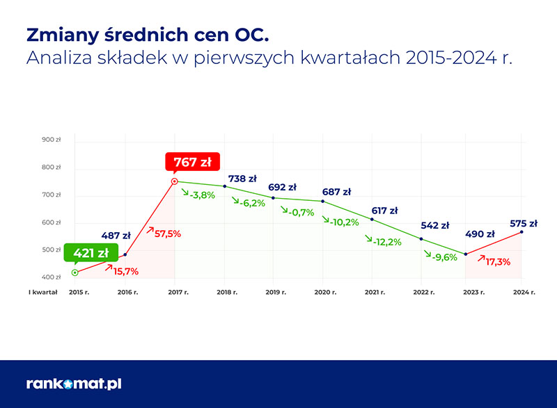 Autorzy raportu przypominają, że w latach 2015–2017 miał miejsce dynamiczny wzrost stawek. Najmocniejszy odnotowano w I kwartale 2017 r. (57,5%). Przeciętna składka OC ppm. zaczęła obniżać się dopiero pod koniec 2017 r. – jej cena spadała w ujęciu kwartalnym do zeszłego roku. W I kw. 2024 r. średnia stawka wyniosła 575 zł i była o 17,3% wyższa niż w I kw. 2023 r.