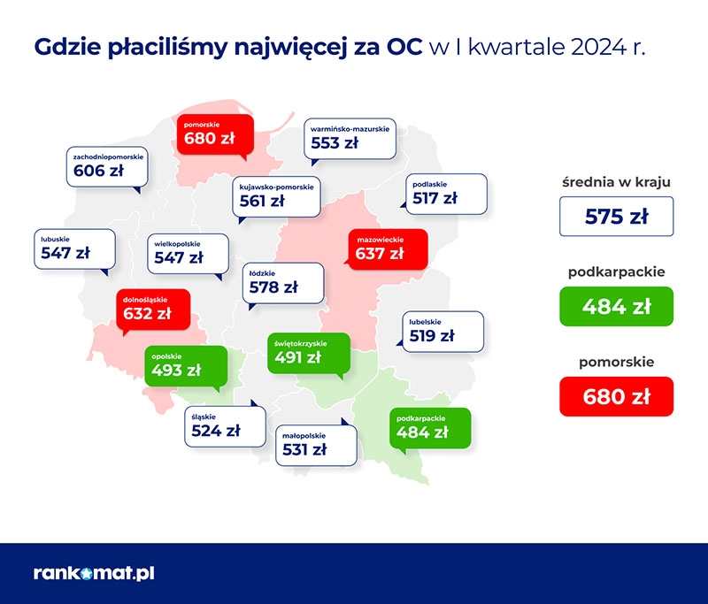 Najwięcej za OC ppm. płacili kierowcy z województw: pomorskiego (680 zł), mazowieckiego (637 zł) i dolnośląskiego (632 zł). Na najniższe ceny mogli natomiast liczyć kierowcy z podkarpackiego (484 zł), świętokrzyskiego (491 zł) i opolskiego (493 zł). Ceny ubezpieczenia były wyższe niż przed rokiem we wszystkich województwach. Podwyżki w poszczególnych regionach wyniosły od 13,4% (świętokrzyskie) do 19,2% (warmińsko-mazurskie).