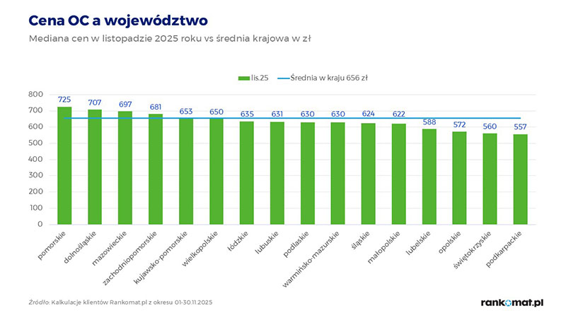 Tylko cztery województwa przekraczają średnią krajową: pomorskie (725 zł), dolnośląskie (707 zł), mazowieckie (697 zł) i zachodniopomorskie (681 zł). W tych regionach polisy przewyższają średnią stawkę od 3,8% do 10,5%.