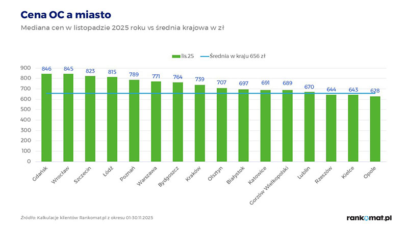 W dużych miastach najwięcej za OC ppm. płacą kierowcy w Gdańsku (846 zł), Wrocławiu (845 zł) i Szczecinie (823 zł – od 24,5% do 28,8% powyżej średniej). Niższe ceny zanotowano jedynie w Rzeszowie (644 zł), Kielcach (642 zł) i Opolu (628 zł), gdzie OC ppm. kosztuje od 1,8% do 4,3% mniej niż wynosi średnia dla całej Polski
