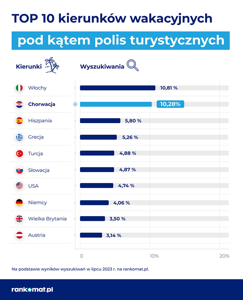 Ubezpieczenie do Chorwacji jest najczęściej kupowane na Rankomat w miesiącach letnich, a szczyt zainteresowania przypada na lipiec. W lipcu 2023 r. Chorwacja była drugim najczęściej wyszukiwanym krajem pod kątem zakupu ubezpieczenia (10,28% wszystkich kalkulacji), wyprzedzając inne popularne kierunki, jak Hiszpania, Grecja czy Turcja. To także najlepszy wynik ze wszystkich krajów bałkańskich. Daleko w tyle były Czarnogóra (1,5%) i Albania (1,41%). Minimalnie popularniejsze od Chorwacji okazały się tylko Włochy (10,81%).