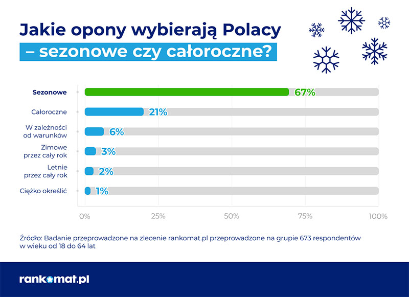 Zwolennicy sezonówek są w większości – twierdząco na pytanie o to, czy zmieniają opony, odpowiedziało 67% respondentów. Tuż za nimi znajduje się grupa kierowców, którzy decydują się na jazdę na oponach całorocznych, zwanych także wielosezonowymi. 21% badanych wskazało, że ten typ opony odpowiada im zarówno latem, jak i zimą. Są i tacy, którzy bacznie obserwują prognozę pogody – 6% badanych ewentualną wymianę opon uzależnia od panującej wokół aury i reaguje na bieżąco. Niektórzy, choć niewielu, decydują się na całoroczną jazdę na oponach letnich lub zimowych. To odpowiednio 2% i 3% ankietowanych.