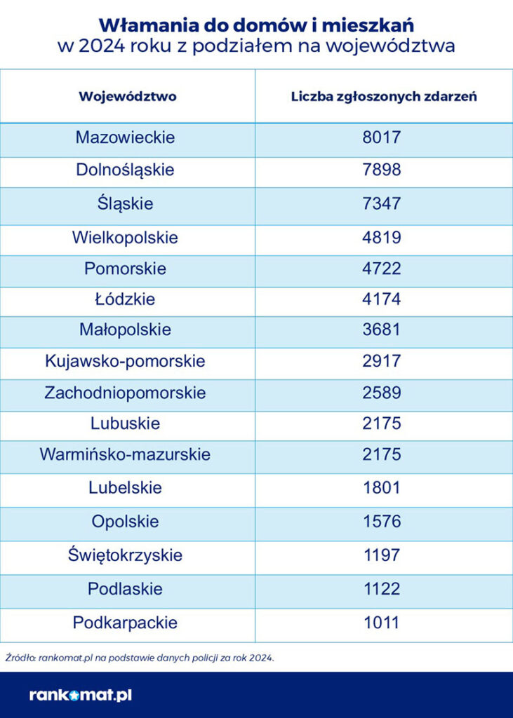 W ostatnim roku najwięcej zgłoszonych kradzieży i włamań do nieruchomości było w województwie mazowieckim. Policja odnotowała 8017 takich zdarzeń. Niewiele mniej w dolnośląskim (7898), i na śląskim (7347). Najmniej włamań miało miejsce w województwach wschodnich, wszędzie poniżej 1200 przez cały rok: 1197 na terenie świętokrzyskiego, 1122 w podlaskim i 1011 w podkarpackim.