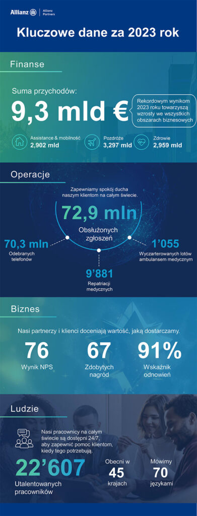 Przychody Allianz Partners w 2023 roku osiągnęły poziom 9,3 mld euro, a zysk operacyjny – 301,2 mln euro. Tym samym firma osiągnęła najlepsze wyniki w swojej historii. Uzyskane przez Allianz Partners rezultaty były efektem osiągnięć w dziale podróży międzynarodowych, dwucyfrowego wzrostu w segmencie mobilności & assistance oraz rekordowego, wynoszącego 23,4% wzrostu w segmencie zdrowotnym.