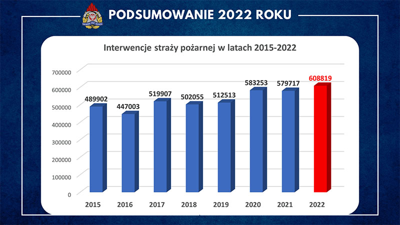 W 2022 roku strażacy odnotowali ponad 608 tysięcy interwencji, o ponad 29 tys. więcej niż w 2021 roku. Była to największa liczba zdarzeń w 30-letniej historii Państwowej Straży Pożarnej – podała Komenda Główna PSP.