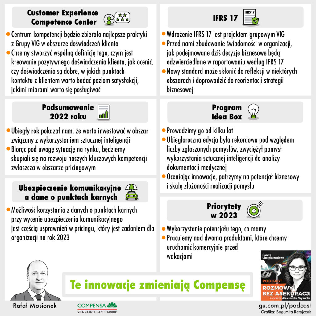 Drugie miejsce pod względem słuchalności przypadło odcinkowi nr 215, noszącemu tytuł „Te innowacje zmieniają Compensę”. Uczestniczący w programie Rafał Mosionek, wiceprezes Compensy TU i prezes Beesafe, ujawnił, na jakie innowacje stawia Compensa. Podczas rozmowy ekspert wyjaśnił też, jakie są plany Customer Experience Competence Center VIG i czemu siedziba inicjatywy jest w Polsce, oraz opisał innowacyjne projekty wdrożone w Compensie w 2022 roku, a także technologiczne priorytety towarzystwa w 2023 roku.