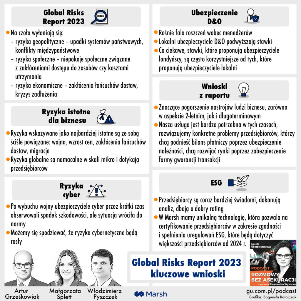 Liderem słuchalności był odcinek nr 217, zatytułowany „Global Risks Report 2023 kluczowe wnioski”. Zaproszeni goście: Artur Grześkowiak, Małgorzata Splett i Włodzimierz Pyszczek z Marsh Polska wskazali, czego boją się przedsiębiorcy w Polsce i Europie. Eksperci podzielili się również swoją wiedzą i prognozami na temat kluczowych wyzwań dla biznesu w najbliższych latach oraz ujawnili, jak aktualne zmiany wpływają na rynek ubezpieczeń finansowych, D&O i cyber.