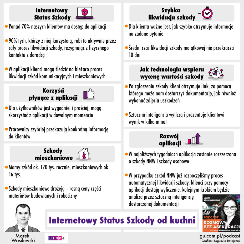 Drugie miejsce pod względem słuchalności przypadło odcinkowi nr 218, noszącemu tytuł „Internetowy Status Szkody od kuchni”. Uczestniczący w programie Marek Wasilewski z LINK4 opowiedział o tym, jak rozwija się aplikacja „Internetowy Status Szkody”, ile osób z niej skorzystało oraz jakie jej funkcjonalności sprawdziły się, a co trzeba było poprawić. Ekspert ujawnił również, czy nowe rozwiązanie pozwala na automatyczną wycenę szkody z użyciem rozpoznawania obrazu, a także ile szkód mieszkaniowych likwiduje rocznie jego firma i jaka jest ich średnia wartość.