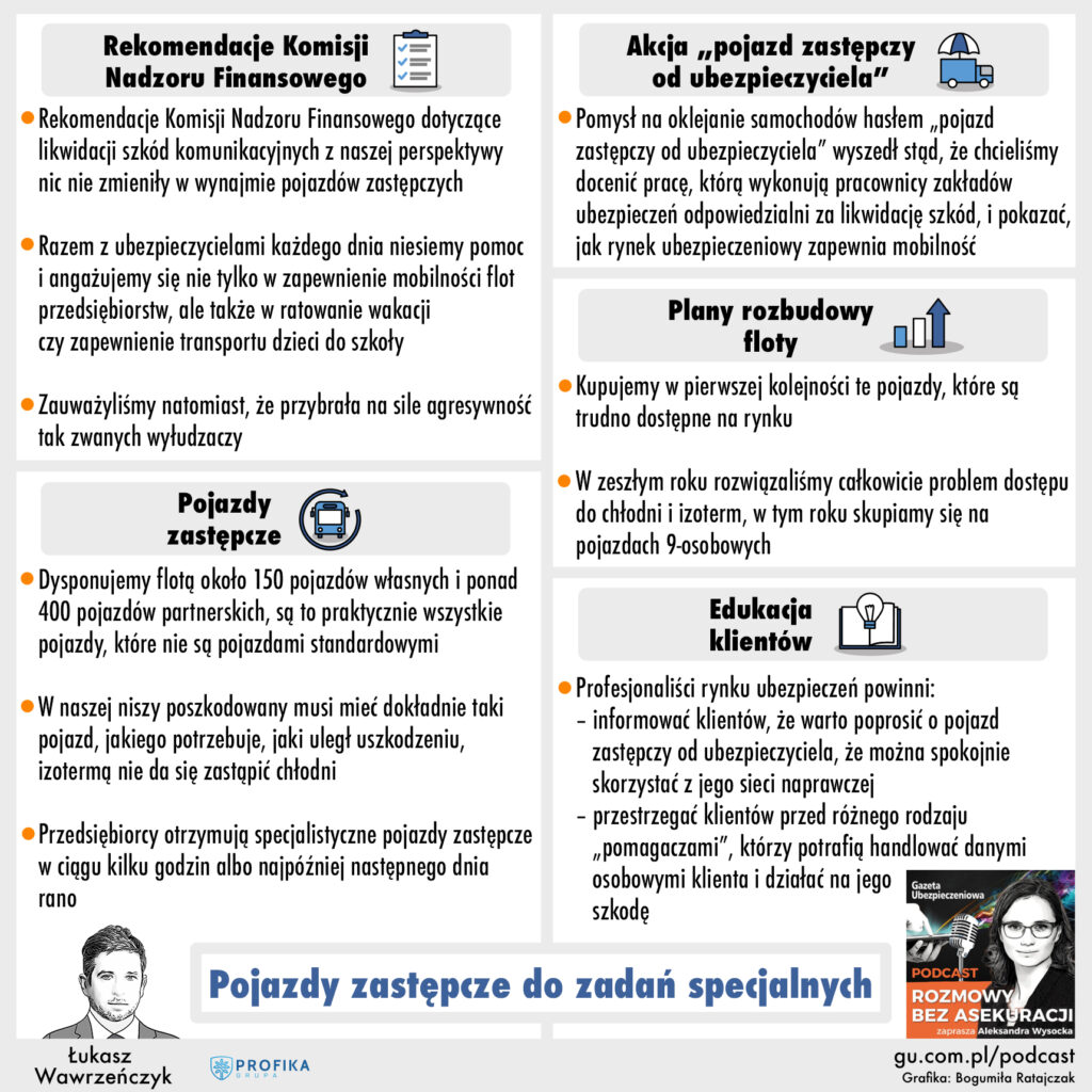 Trzecia lokata przypadła odcinkowi nr 219 pod tytułem „Pojazdy zastępcze do zadań specjalnych”. W programie udział wziął Łukasz Wawrzeńczyk z Grupy Profika, który podzieli się swoją opinią na temat tego, jak rekomendacje Komisji Nadzoru Finansowego dotyczące likwidacji szkód komunikacyjnych wpłynęły na firmy wynajmujące samochody specjalizujące się w wynajmie pojazdów zastępczych. Zaproszony gość wyjaśnił także w jakim stopniu specjalizacja Grupy Profika w dostarczaniu klientom wszystkich rodzajów pojazdów zastępczych, zwłaszcza tych nietypowych, wpłynęła na jej działalność, a także jakie wyzwania stawia to przed firmą w zakresie znalezienia dokładnego pojazdu potrzebnego do określonej sytuacji. Ekspert ujawnił ponadto, dlaczego Profika oznacza swoje nowe pojazdy hasłem „pojazd zastępczy od ubezpieczyciela”.
