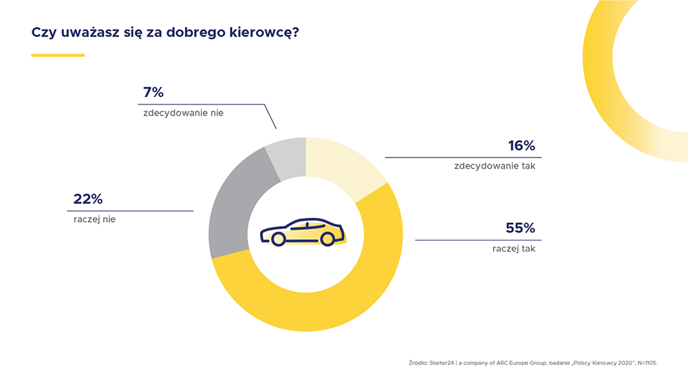 71% badanych ocenia siebie jako dobrych kierowców, z czego 16% jest o tym zdecydowanie przekonanych. Bardziej pewni swoich umiejętności są mężczyźni i najmłodsi kierowcy, ale także respondenci w wieku 18–24 lata. Dotyczy to także najbardziej doświadczonych osób, które prawo jazdy posiadają już od ponad 20 lat.