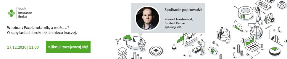 Spotkanie poprowadzi Konrad Jakubowski, Product Owner VSoft Insurance Broker. Podczas webinaru pokaże on, jak prawidłowo dobrane i skonfigurowane narzędzie wpływa na ergonomię pracy i zwiększa jej efektywność. Prezentacja będzie skoncentrowana na procesie ofertowania, tak aby uczestnicy mogli w pełni poznać proces obsługi zapytania.