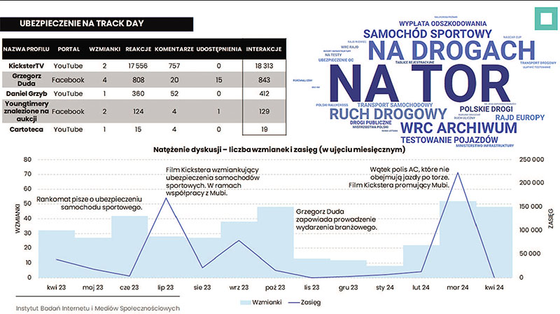 Warto zauważyć, że największą aktywność wygenerował kanał YouTube popularnego influencera motoryzacyjnego – KicksterTV – który próbował swoich sił w zróżnicowanych dyscyplinach motorsportowych. W ramach współpracy z wyszukiwarką ubezpieczeń Mubi promował on badany temat w opisach swoich filmów, zachęcając np. do sprawdzenia ofert dla samochodów rajdowych.